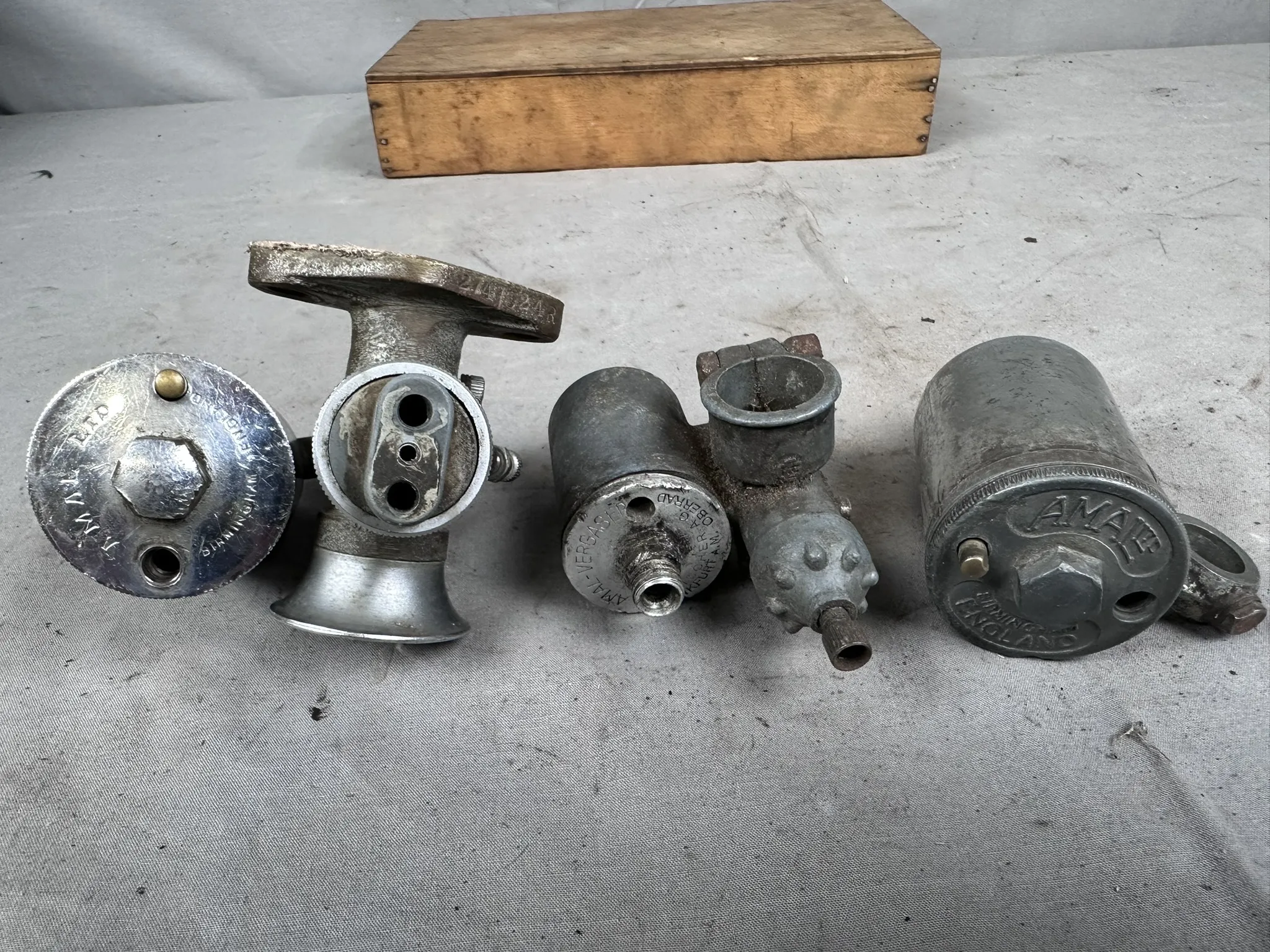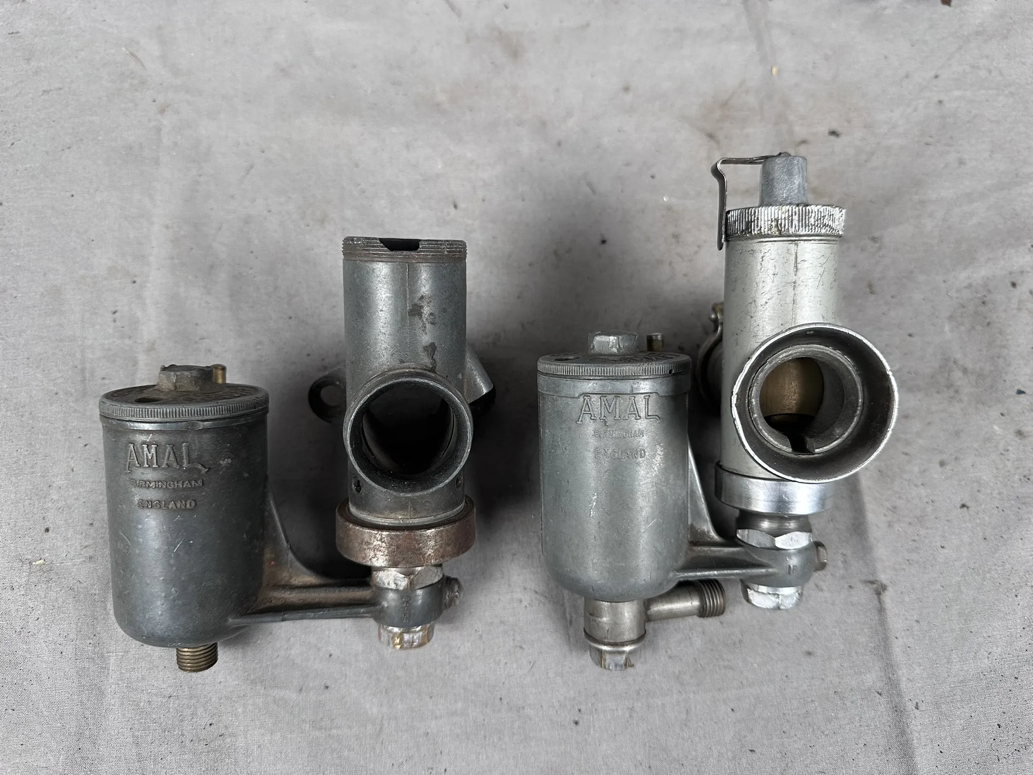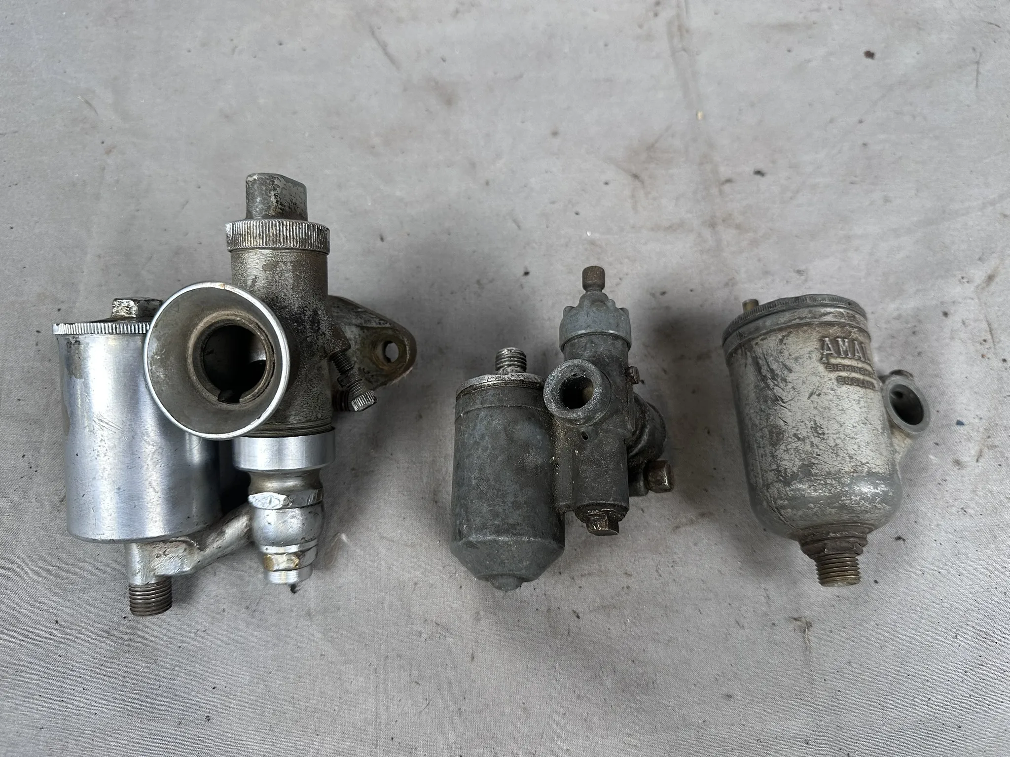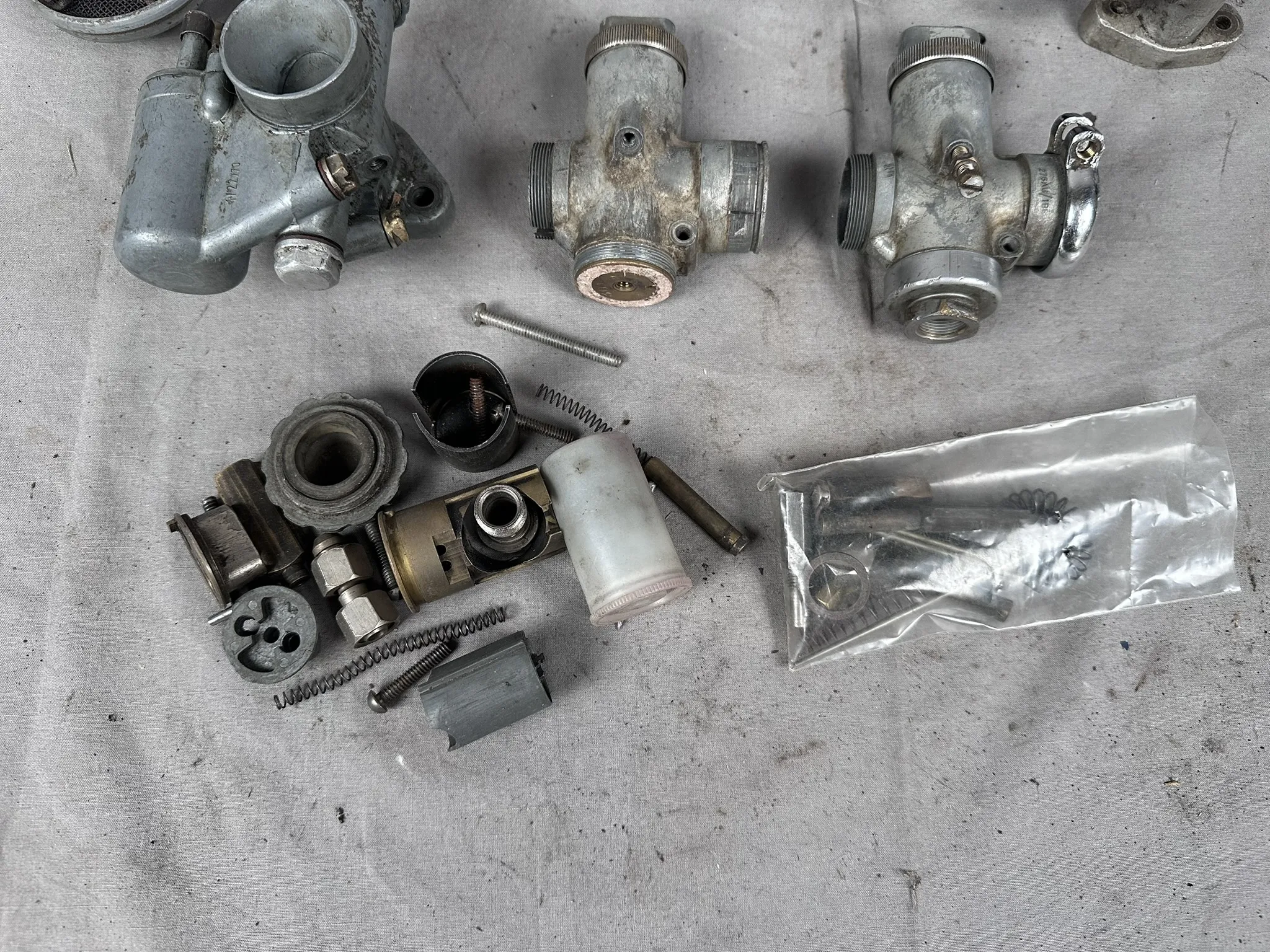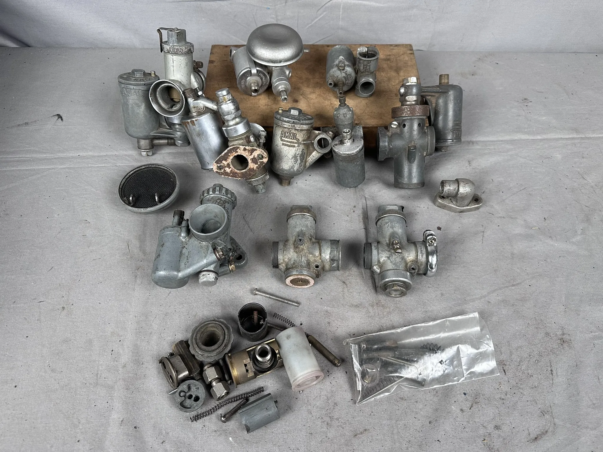 Parti med förgasare och förgasardelar. Bland annat Amal 274/024R, Amal 276AU/1BE, Bing 1/22/70, Sawe K15 m.m.