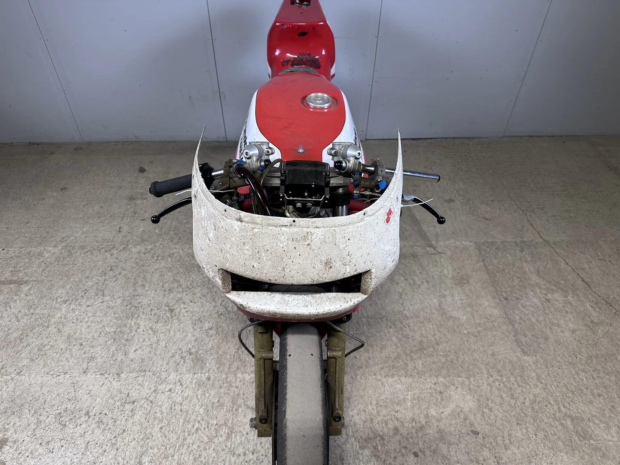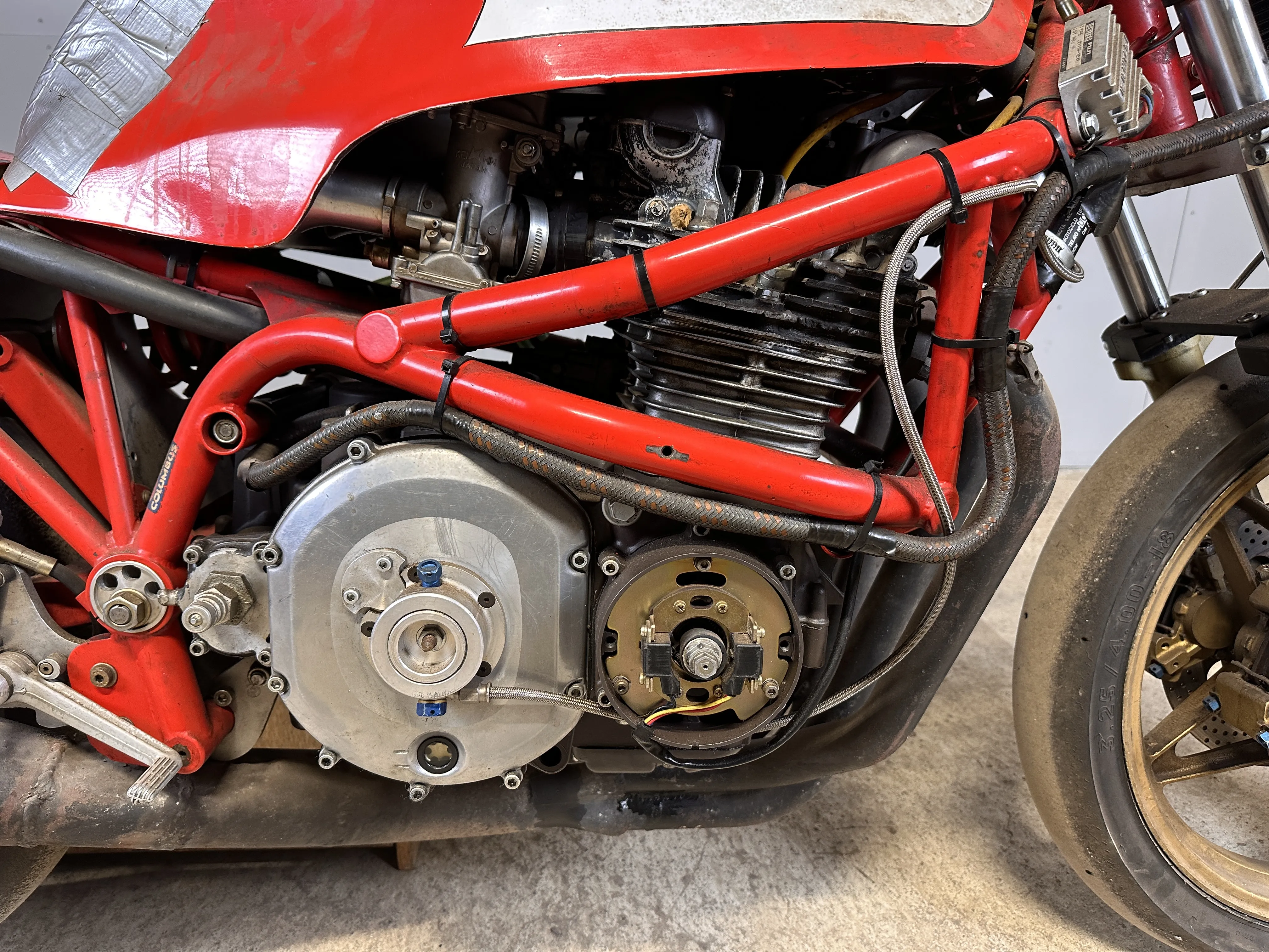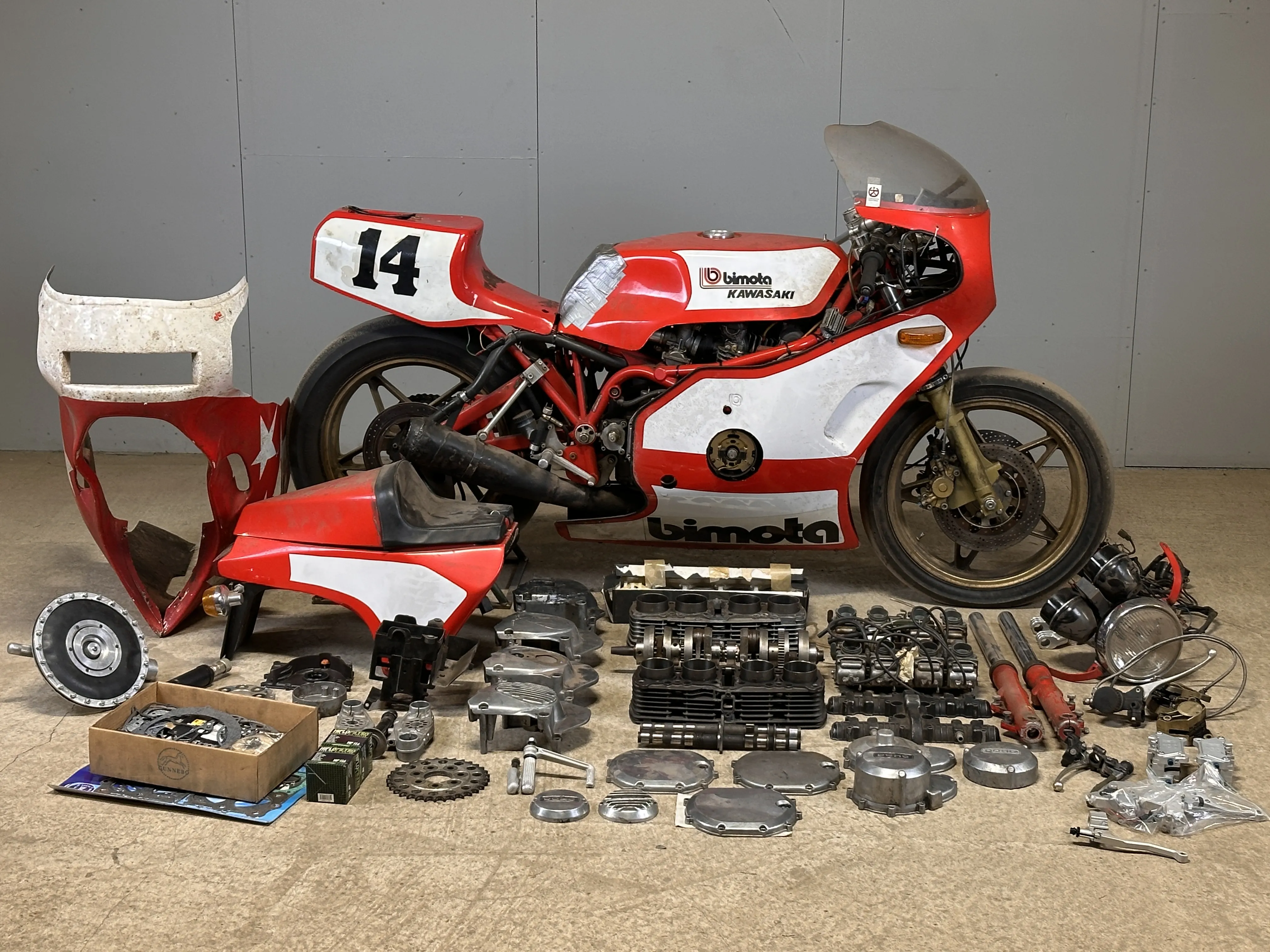 Övrigt: Medföljer ett stort parti delar, bland annat delar till original motor, original gaffel, racing kåpa, säte, bromsar och mycket mer. I stort sett allt följer med för att kunna få den godkänd för landsvägsbruk.