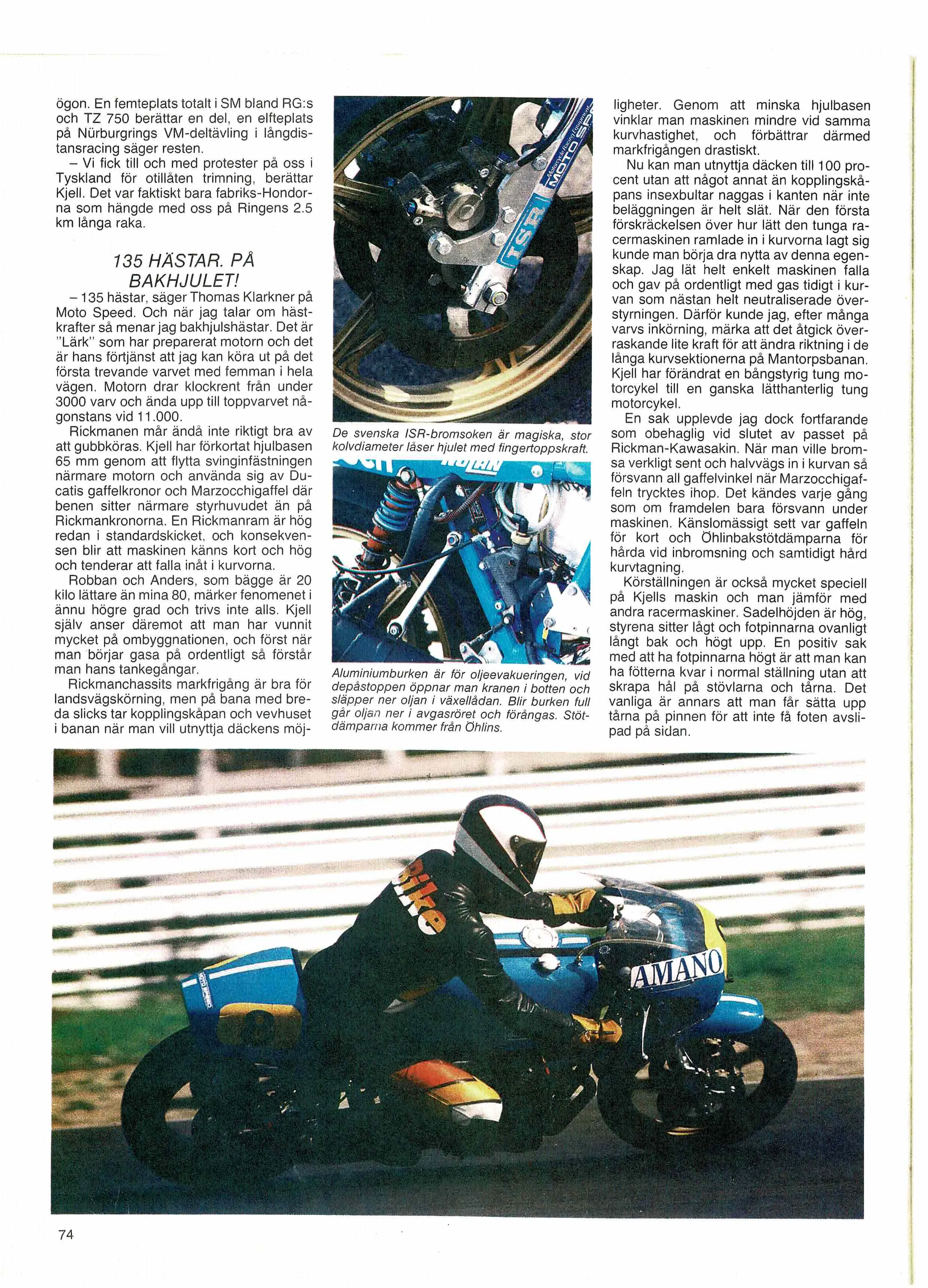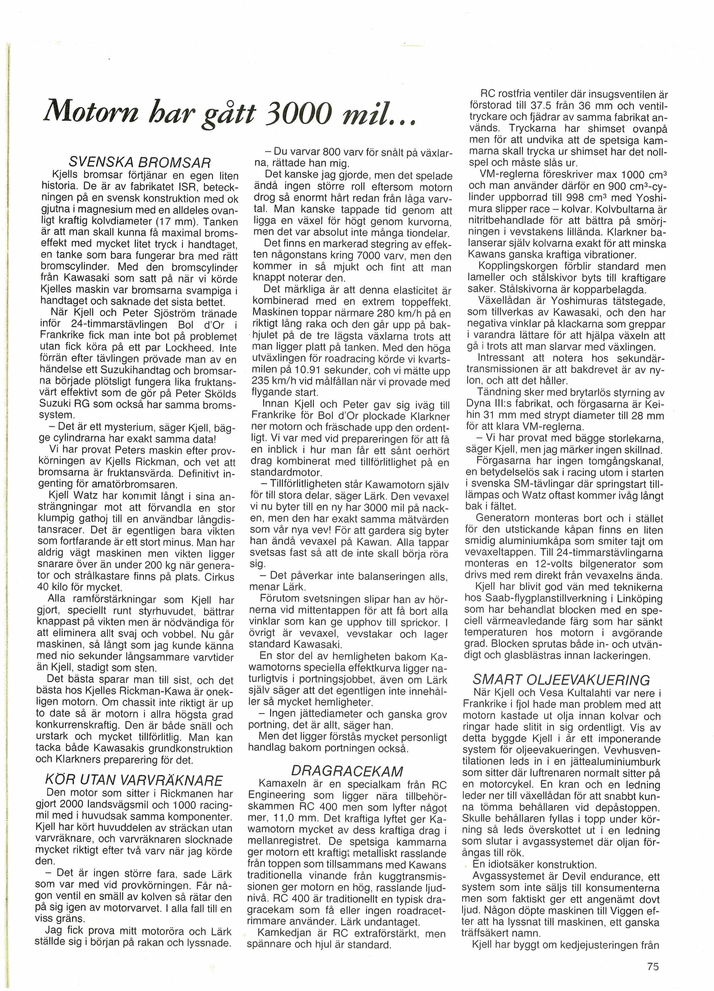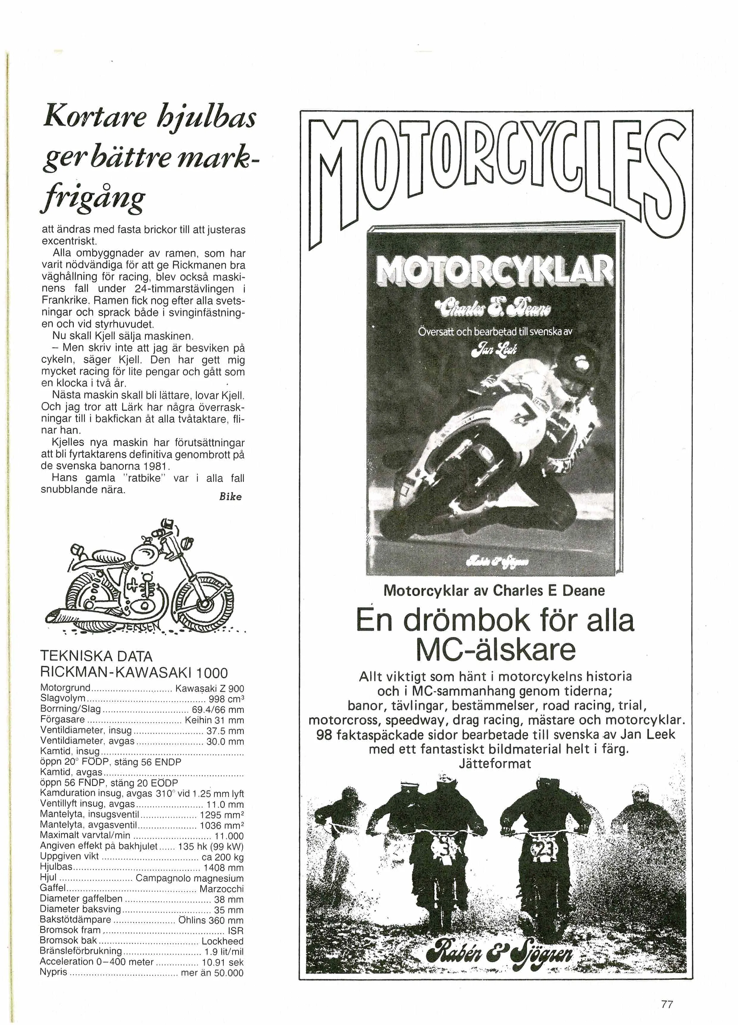 Historik: Köptes ny av Per-Erik "Ecke" Eriksson år 1980 och han var enda ägaren och ska nu säljas efter hans bortgång. Ecke var en mångsysslare av rang som gillade fart, han intog bland annat det inofficiella tidsrekordet mellan Säter och Östersund. Cykeln är körd både på bana och på landsväg. Tidigt 80-tal så inköptes ytterligare en motor som ursprungligen kommer från Kjell Watz, motorn vart trimmad av Thomas Klarkner och satt då i en Rickman-Kawasaki kallad "Viggen", det gjordes ett repotage om den motorn som ligger med i bildmaterialet. Detta är den motor som sitter monterad idag.