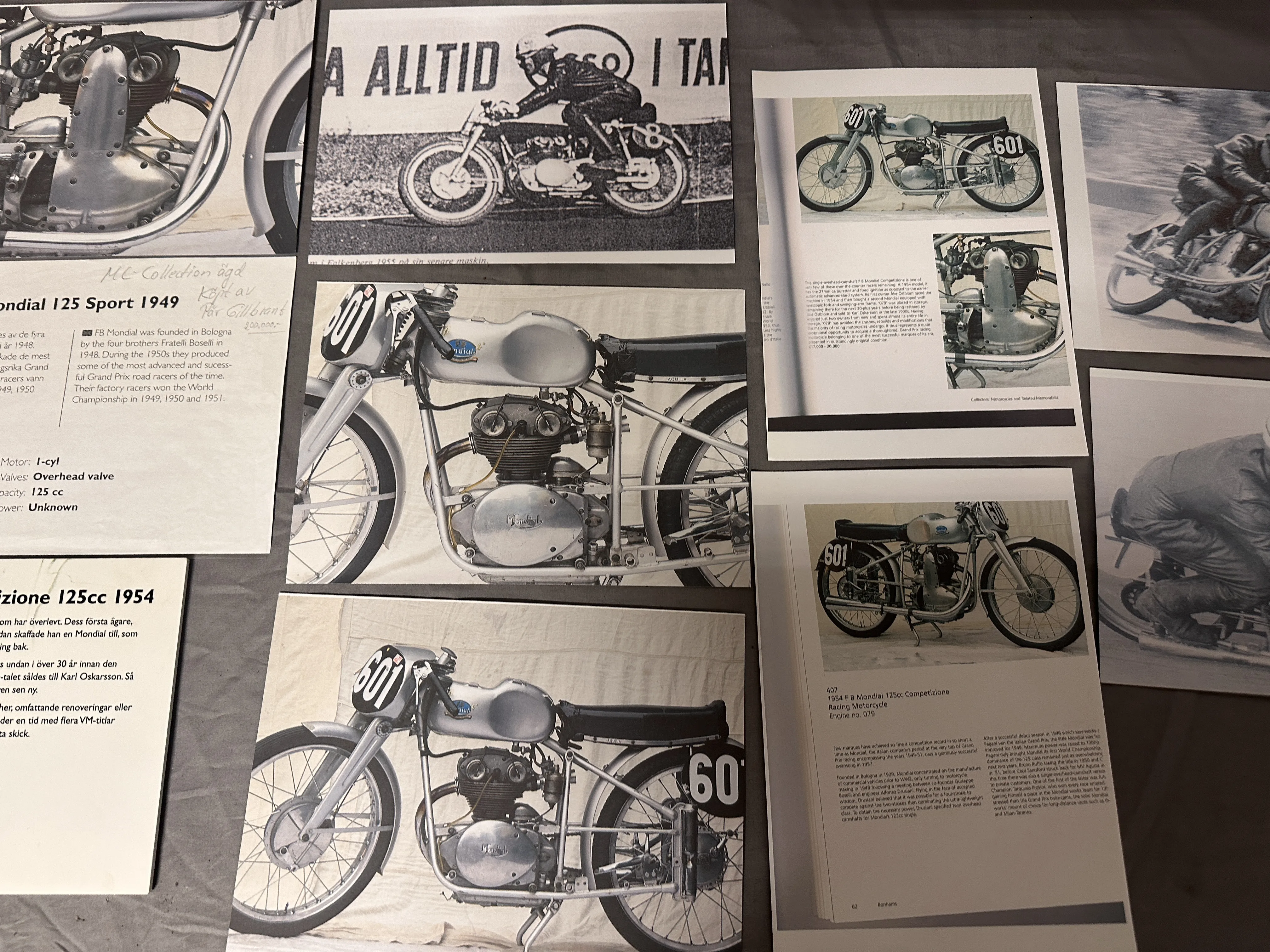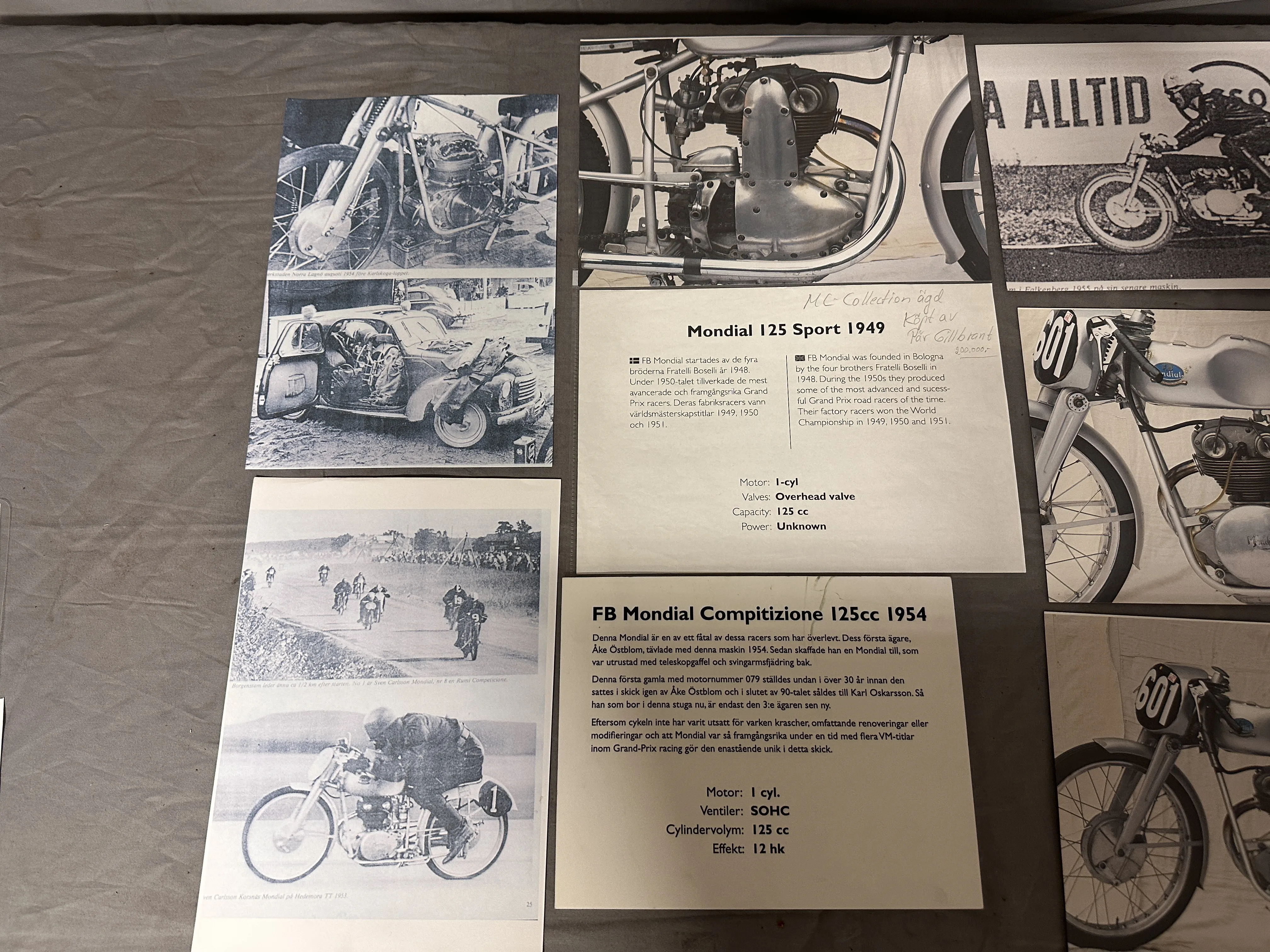 Just denna maskin är en enkel överliggande kamaxel FB Mondial Competizione som såldes ny till Åke Östblom, som tävlade med denna maskin 1954. Maskinen blev sedan undanställd i 30 år varefter den sattes i skick igen av Åke Östblom och i slutet av 90-talet såldes till Karl Oskarsson.