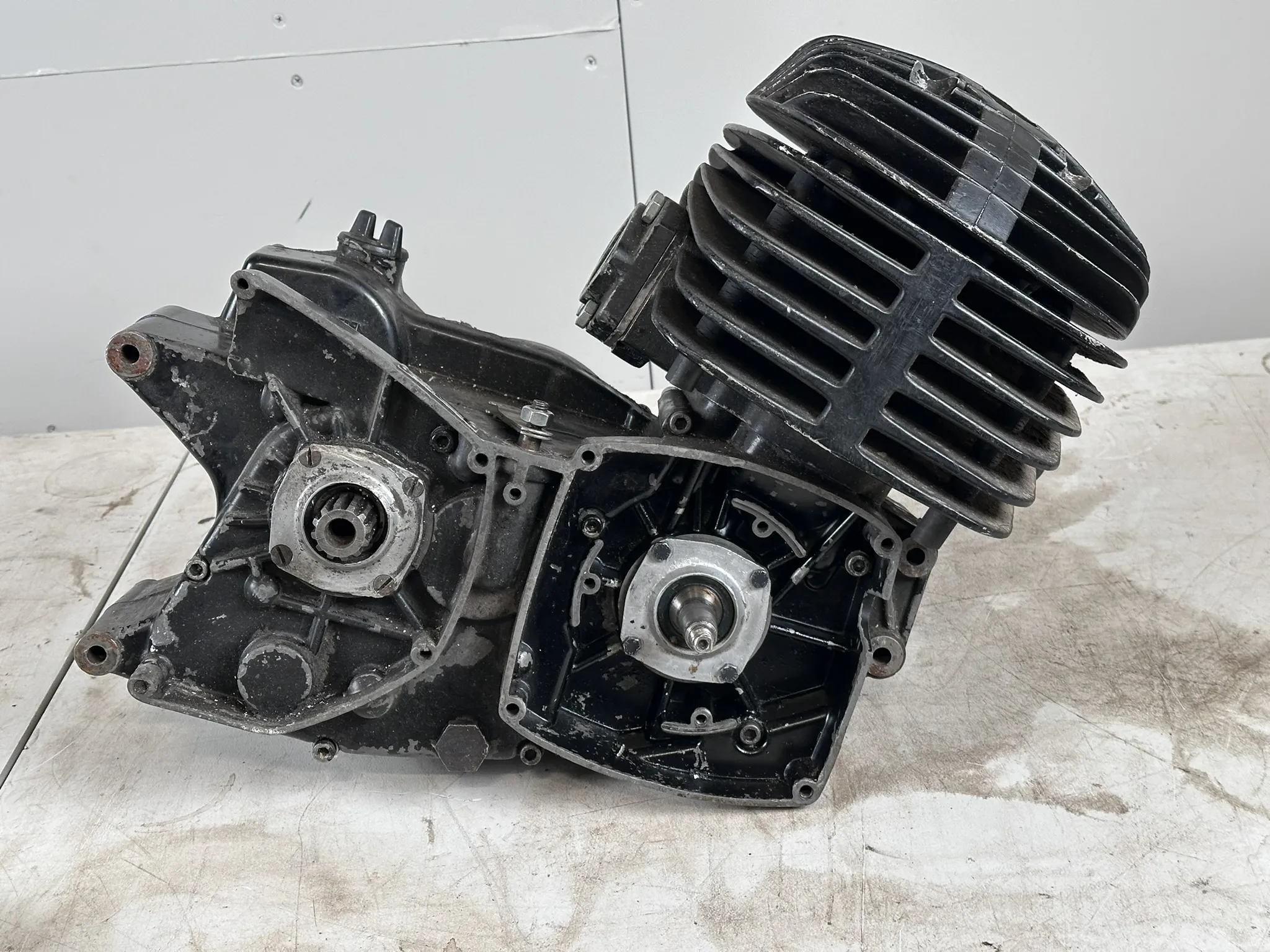 Kondition: Delvis ihopmonterad, Kolv och förgasare följer med men ej monterat, Lagningar förekommer, Tändning saknas, kan ej garanteras komplett