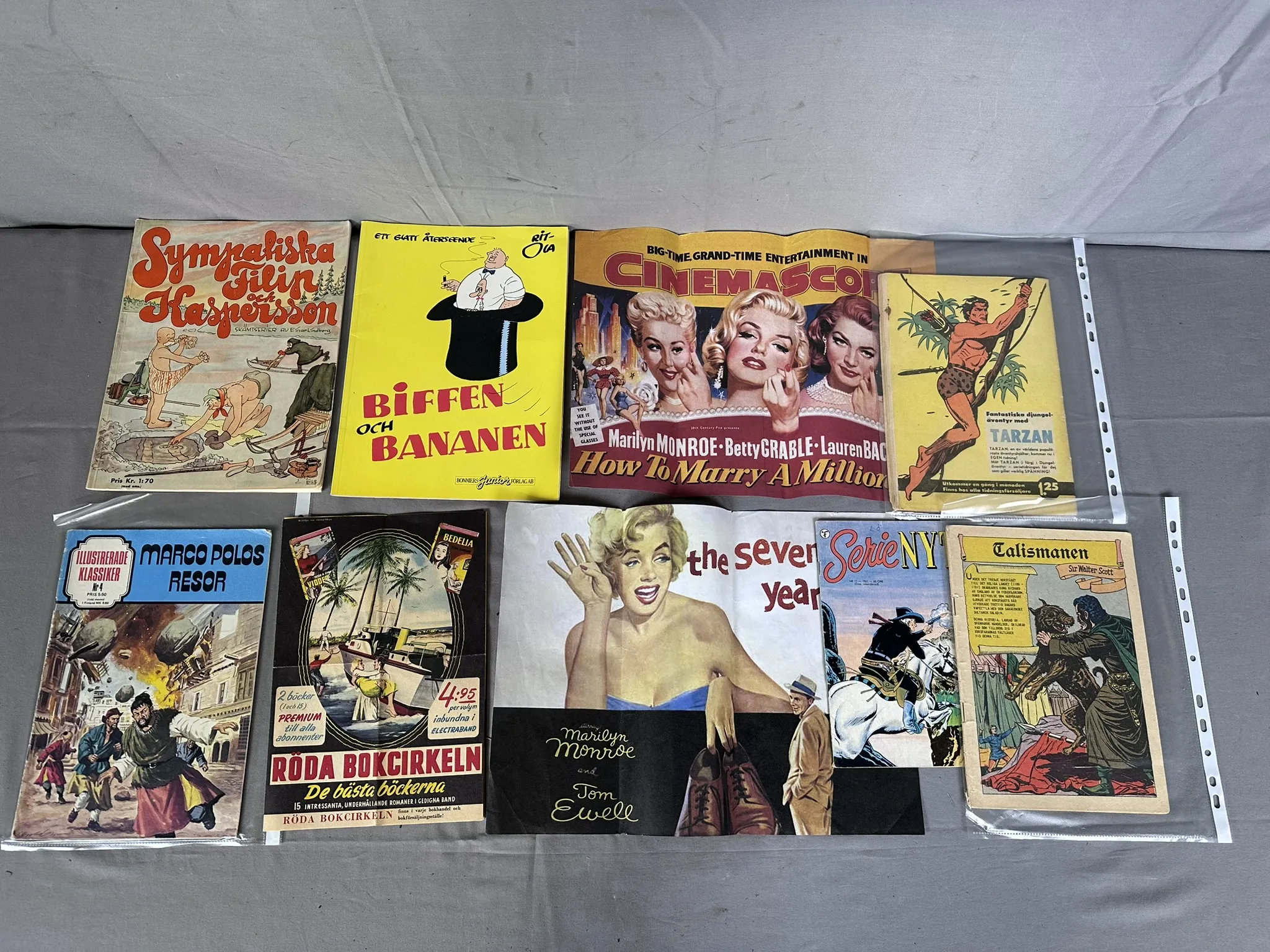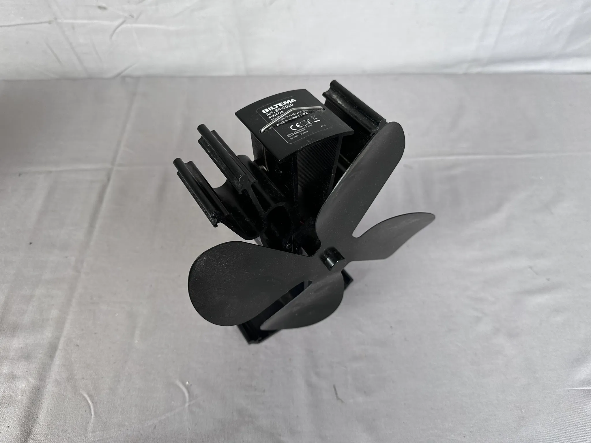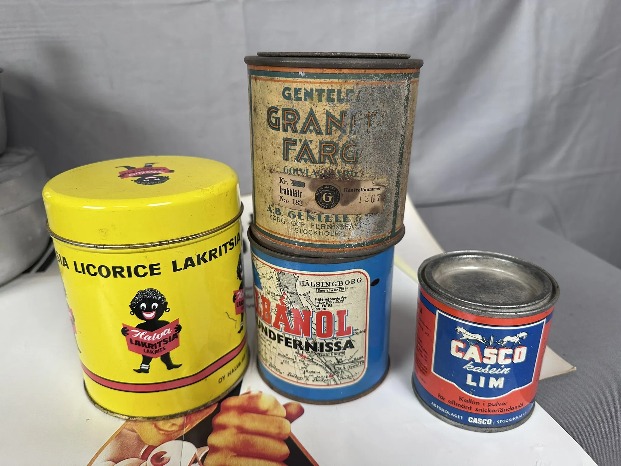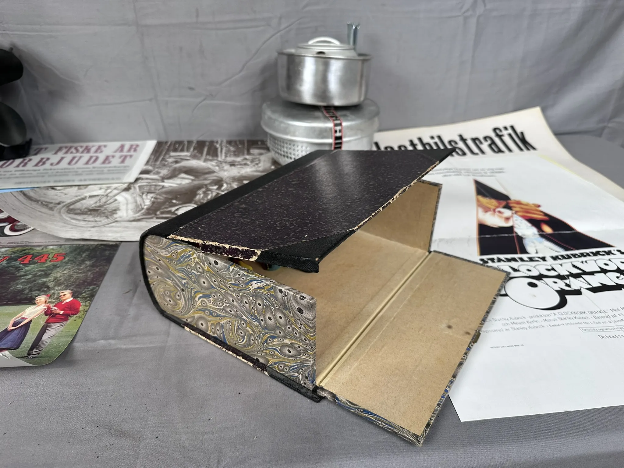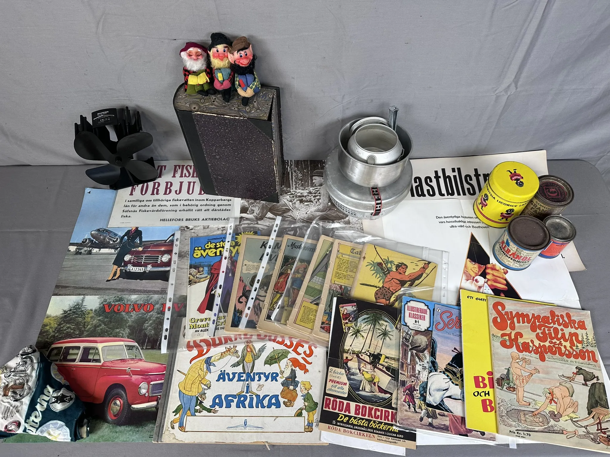 Bl.a skyltar i papp, Böcker, Redskap till spritkök, Kaminfläkt Biltema m.m