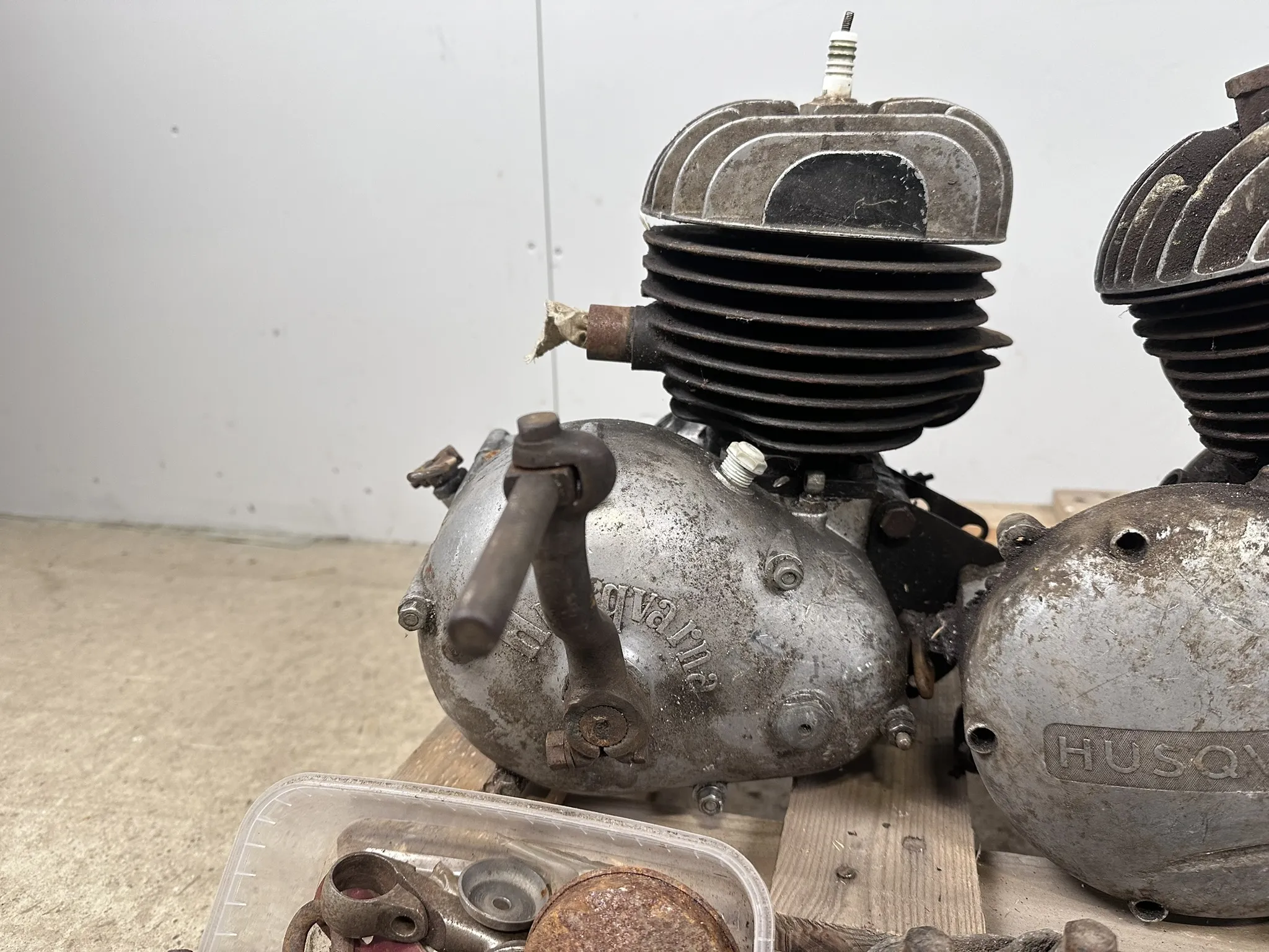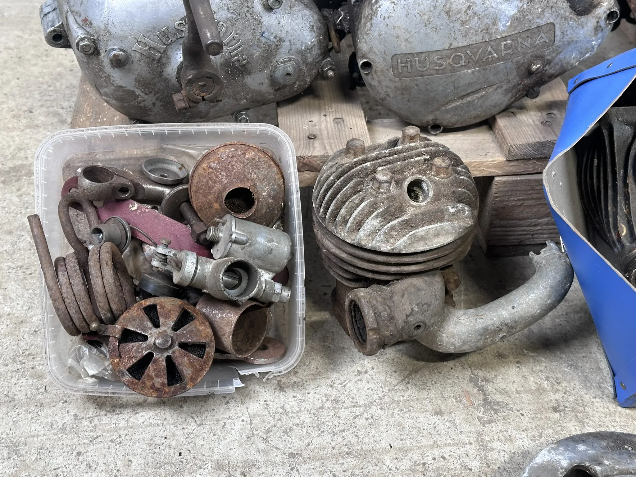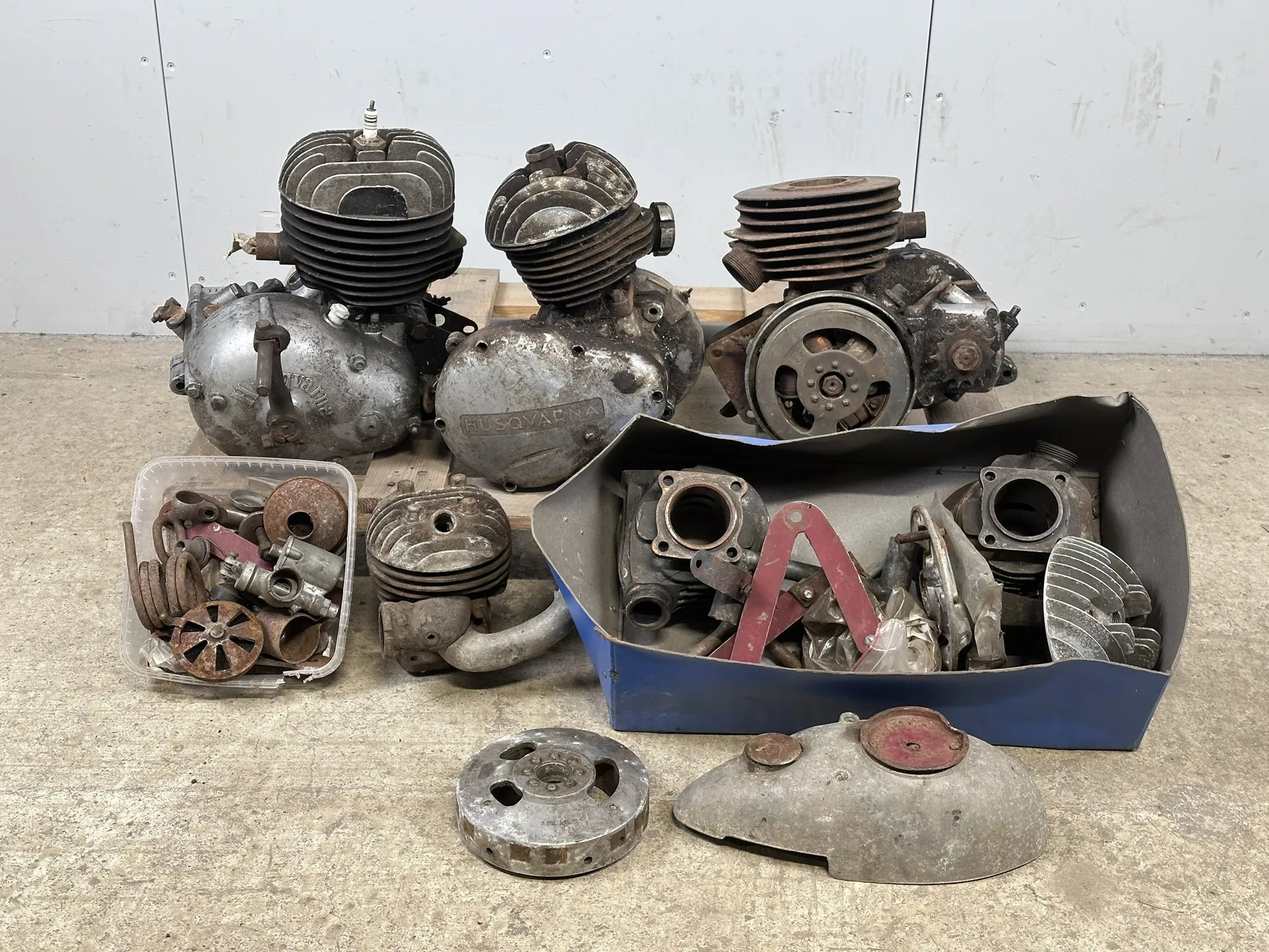 Bl.a 118cc Husqvarnamotor med motornr: 83311,118cc Husqvarnamotor med motornr: 63354, 98cc Husqvarnamotor med motornr: 41476, Svänghjul, cylindrar m.m