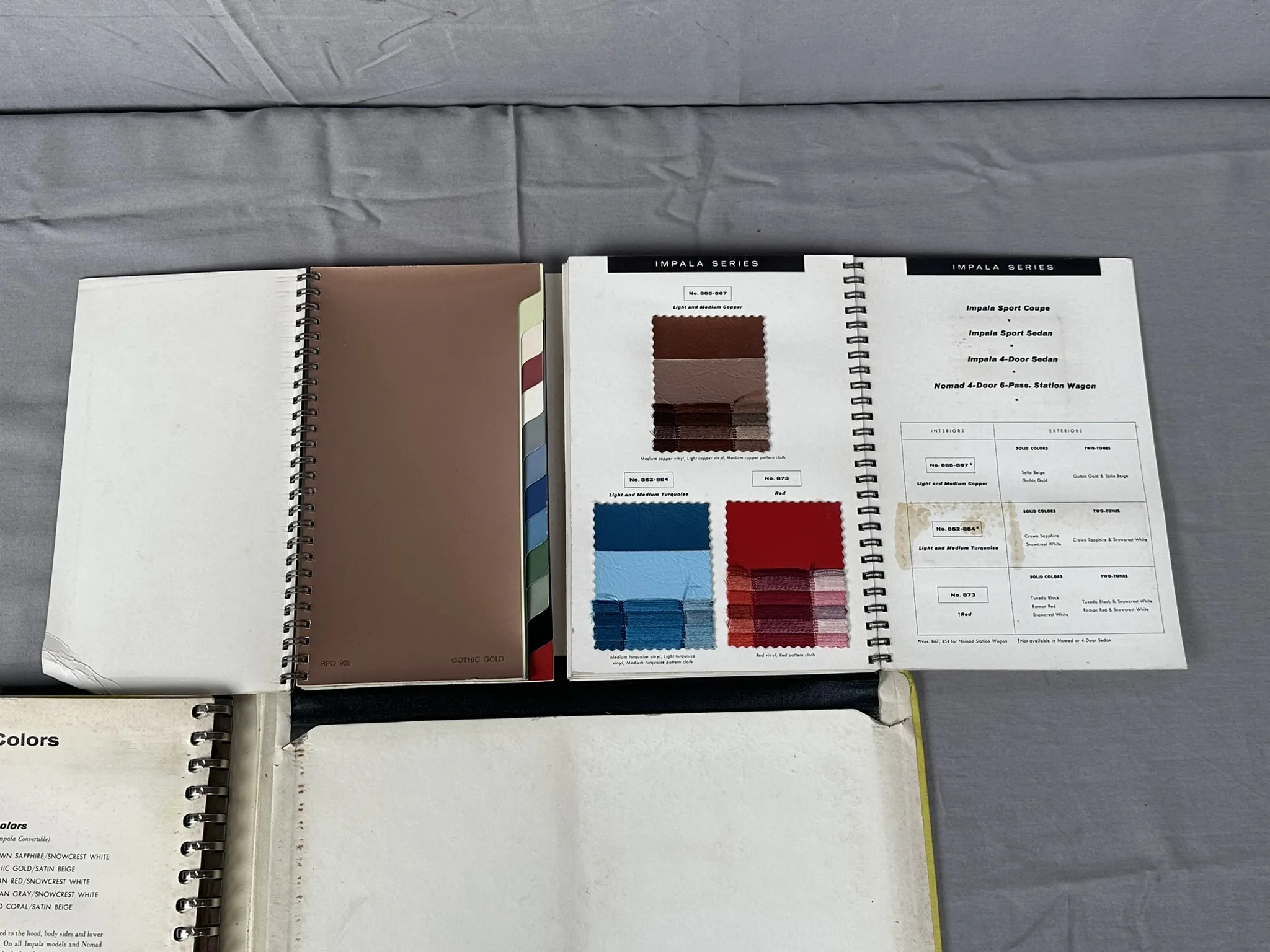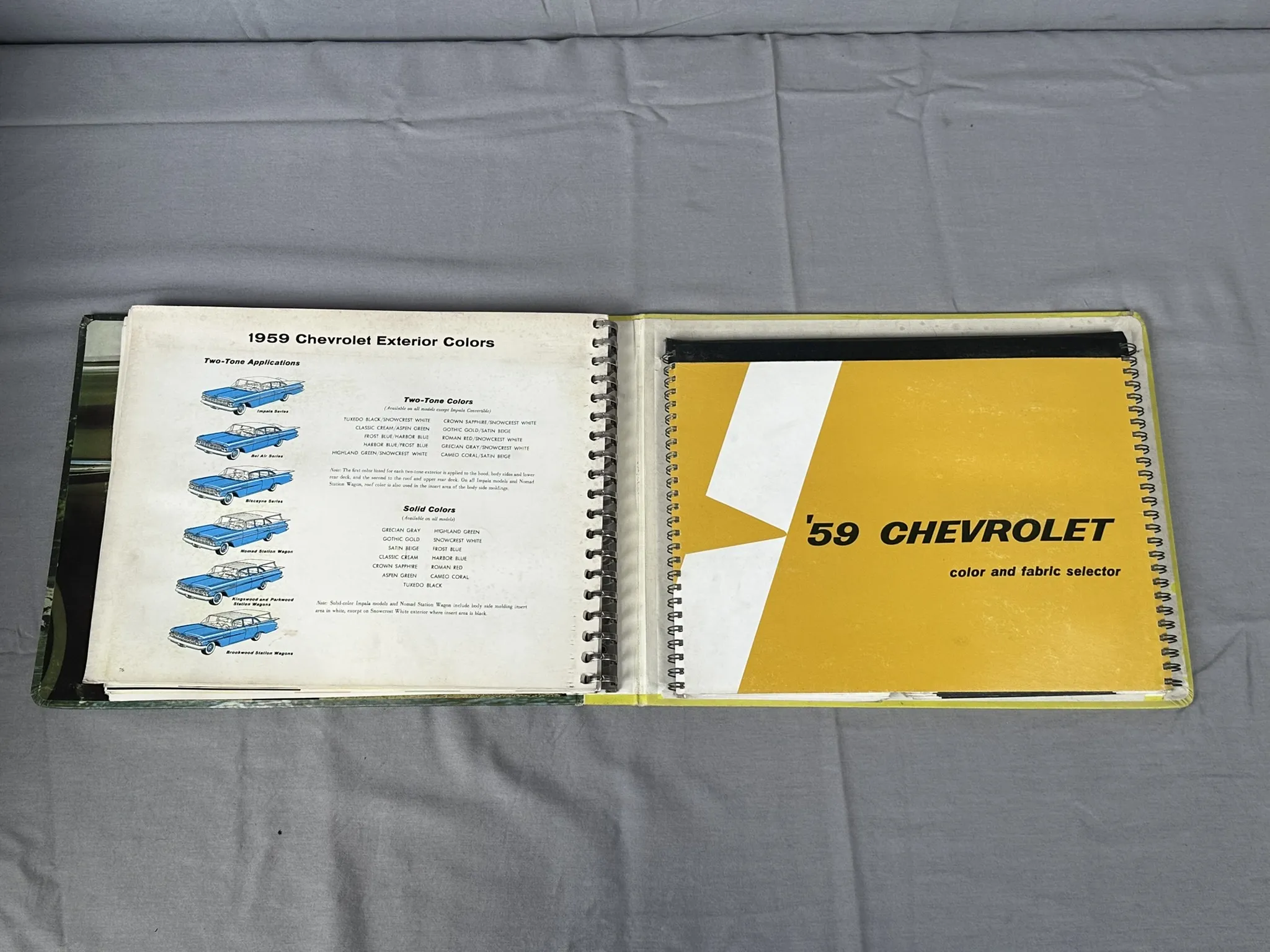 Försäljningsmaterial från handlare för Impala, Bel Air, Biscayne, Station Wagons, Corvette. Innehållande information, färgprover och tygprover m.m.