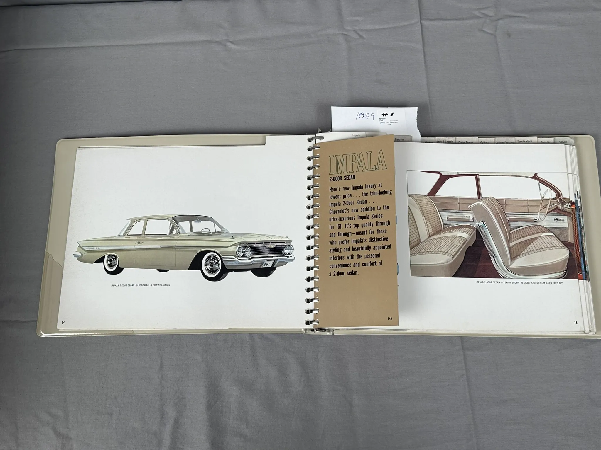 Försäljningsmaterial från handlare för Impala, Bel Air, Biscayne, Station Wagons, Corvette, Corvair. Innehållande information, färgprover och tygprover m.m.