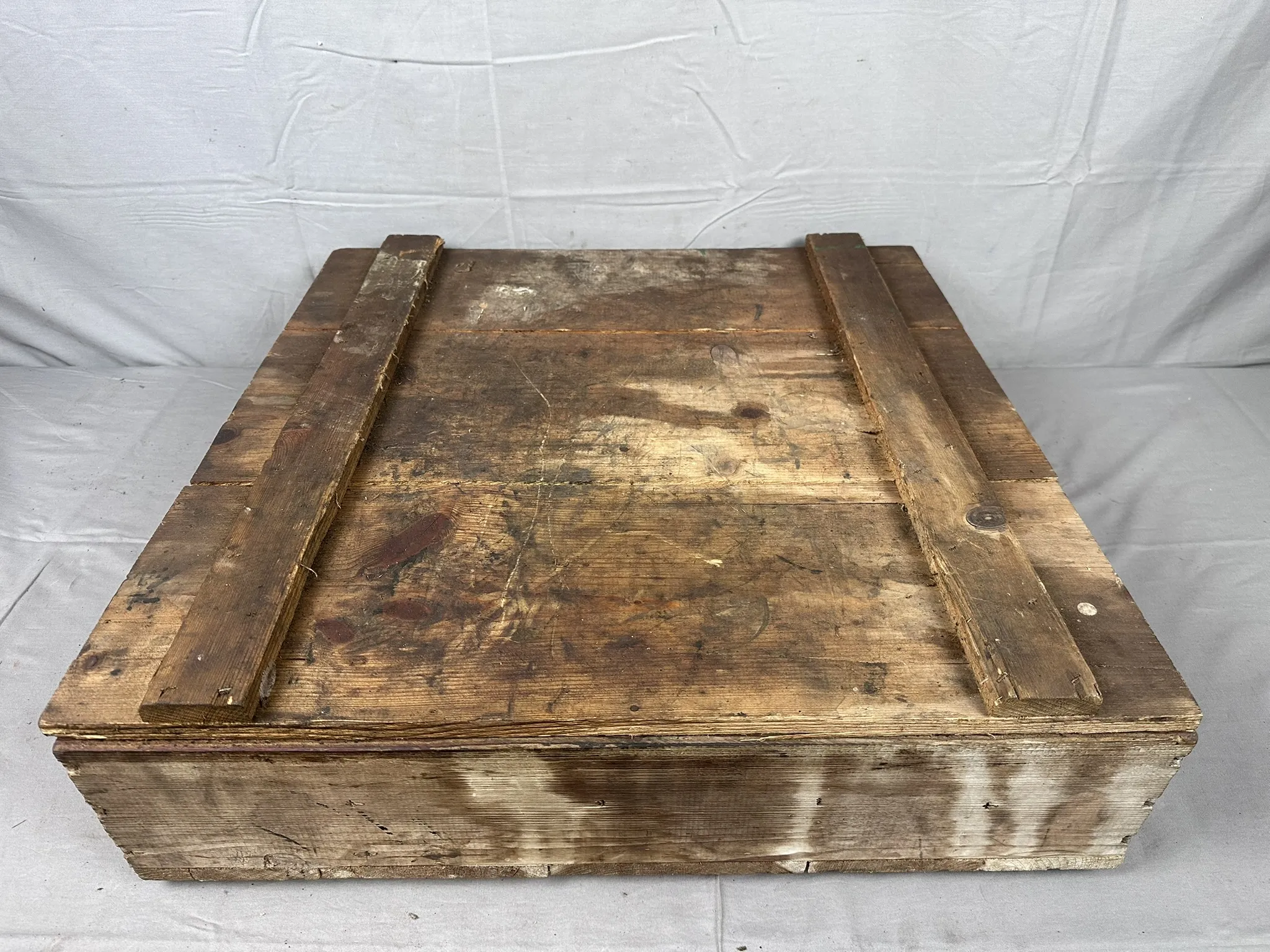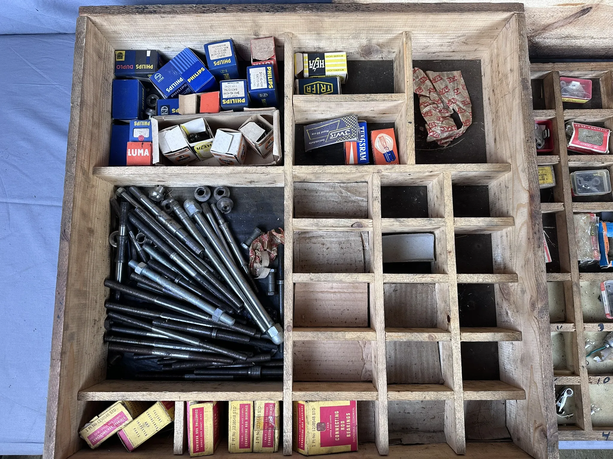 Kondition: Låda har åldersrelaterat slitage, innehåll i varierat skick.