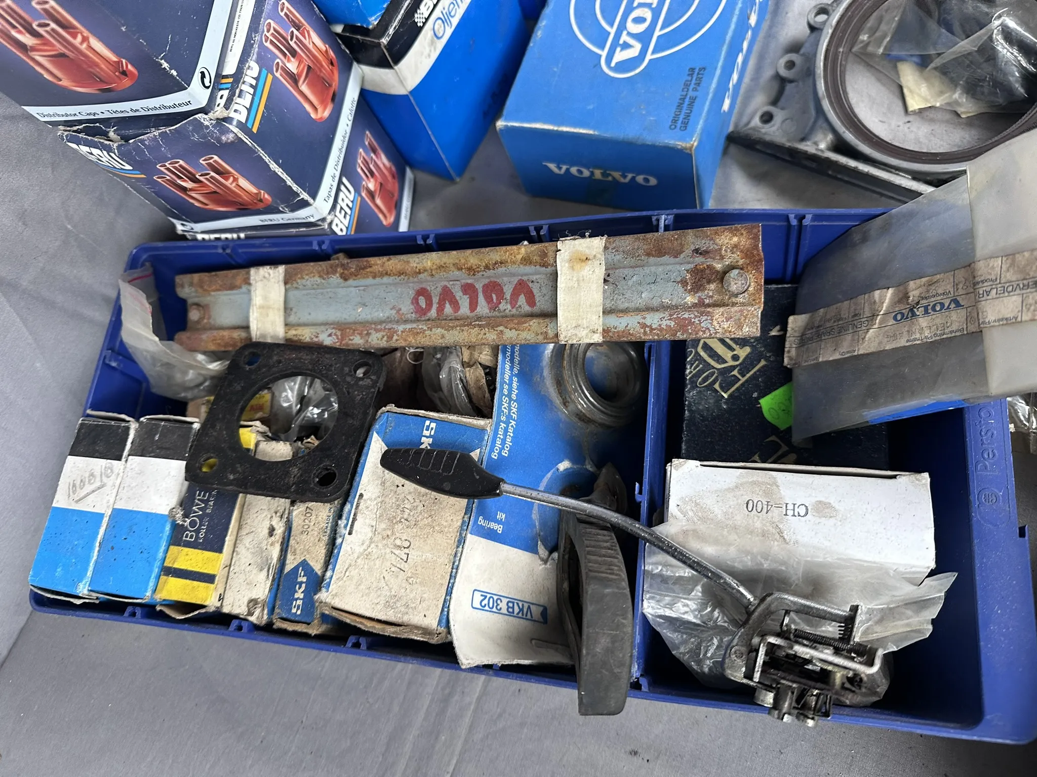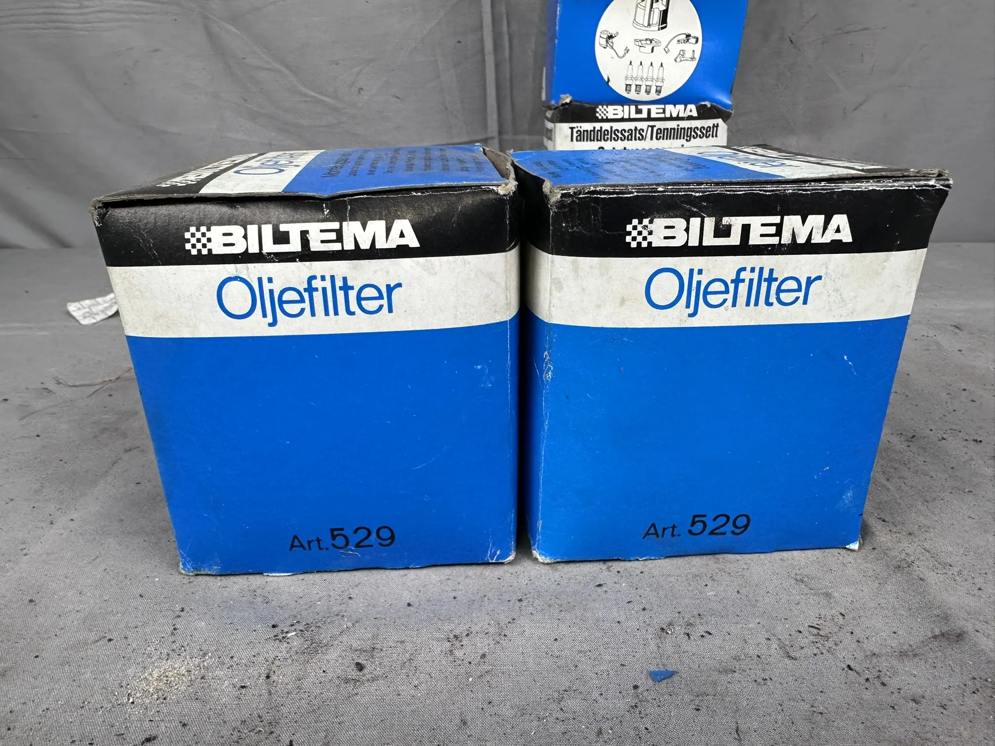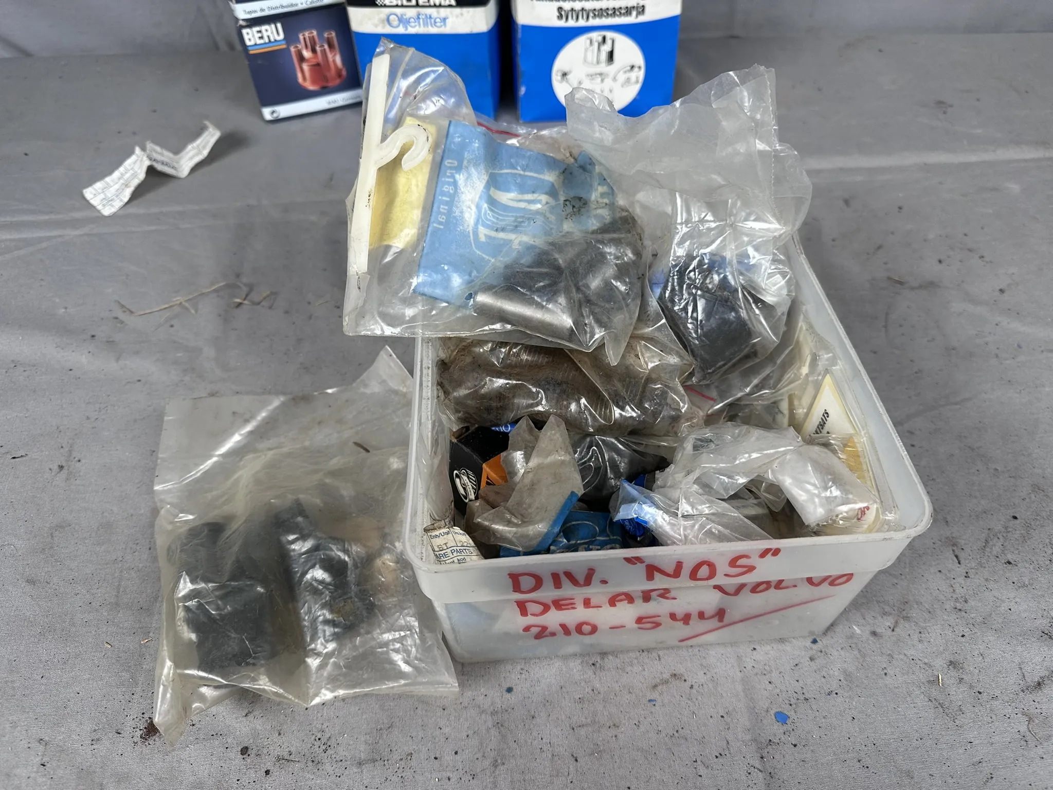 Bland annat: Navkapslar, Bromsljussats (NOS), Tänddelar, Oljefilter m.m.
